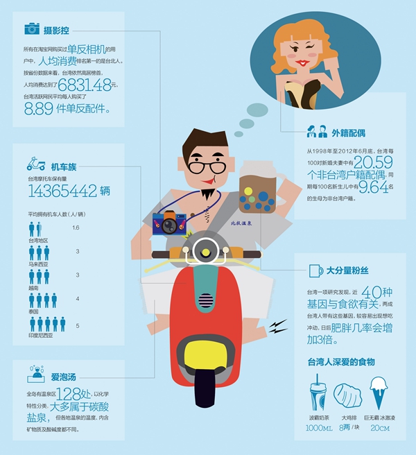 臺(tái)灣人為什么成為臺(tái)灣人,大概和下述幾點(diǎn)有關(guān)。開著“小綿羊”與同伴談?wù)撜螉蕵钒素,買杯波霸奶茶,或點(diǎn)一大份雞排,深愛泡湯和攝影。機(jī)車、美食、泡湯,成為臺(tái)灣人生活方式的重要組成部分。(圖片來源:外灘畫報(bào))