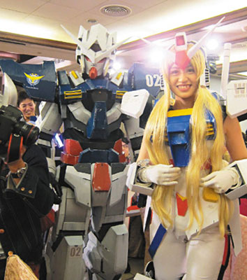 婚宴進(jìn)行到一半時(shí),燈光突然暗下,投影屏幕出現(xiàn)“黑武士”的臉孔,新郎變身2米高的“鋼彈”出場(chǎng),和“黑武士”用光劍PK,在體力漸漸耗盡時(shí),新娘化身“鋼彈娘”到場(chǎng)支援,終于將黑武士擊退,上演一出夫妻“并肩作戰(zhàn)”的好戲。