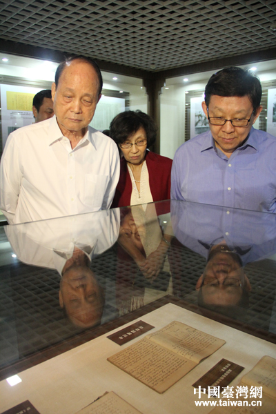 24日下午,海協(xié)會會長陳德銘夫婦與;鶗麻L林中森夫婦一起在福州馬尾參觀了中國船政文化博物館,圖為海協(xié)會會長陳德銘與;鶗麻L林中森參觀當年海校學(xué)生的筆記本。(中國臺灣網(wǎng) 張潔 攝)
