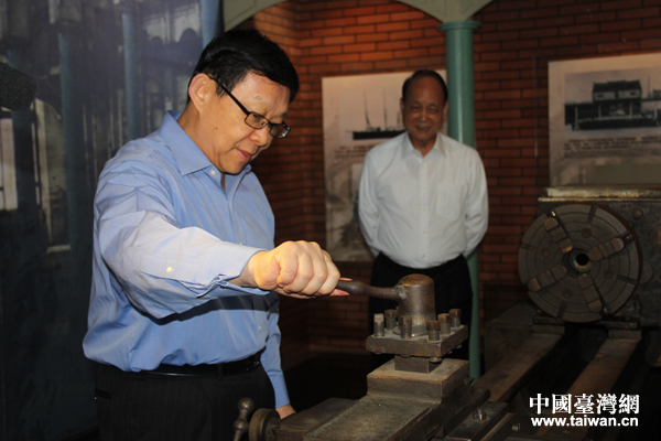 24日下午,海協(xié)會會長陳德銘夫婦與海基會董事長林中森夫婦一起在福州馬尾參觀了中國船政文化博物館,圖為海協(xié)會會長陳德銘操作機床。(中國臺灣網 張潔 攝)