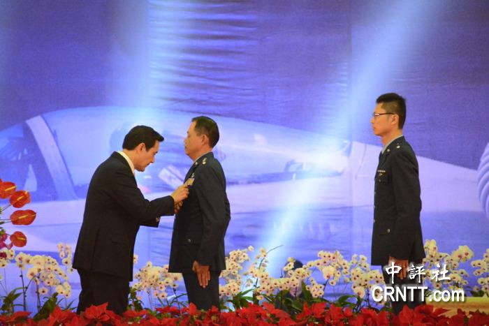 馬英九在經(jīng)國(guó)號(hào)戰(zhàn)機(jī)換裝典禮上表場(chǎng)有功人員。 圖片來(lái)源:香港“中評(píng)社”