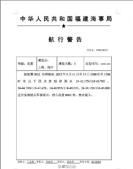 據(jù)中國海事局網(wǎng)站消息,解放軍9月11日至13日15時至17時在臺灣海峽以下四點連線范圍內24-42.17N/118-43.78E、24-44.78N/118-47.67E、24-40.95N/118-49.07E、24-38.13N/118-45.00E進行實彈射擊軍事演習,射擊高度8000米,禁止駛入。