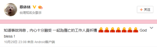 蔡依林29日晚通過認(rèn)證微博回應(yīng)稱,獲悉南寧演唱會(huì)舞臺(tái)搭建現(xiàn)場發(fā)生事故很難過,并為傷亡工作人員祈禱。