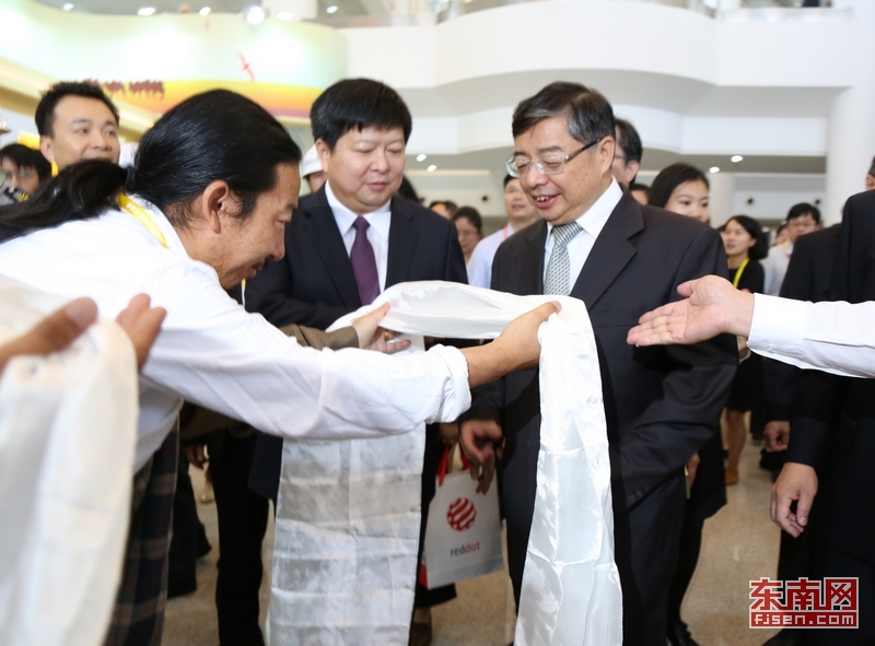 藏族民間彈唱傳承人向中共中央臺灣工作辦公室副主任龍明彪(左一)、福建省委常委、宣傳部部長李書磊(左二)等領(lǐng)導(dǎo)獻(xiàn)上潔白的哈達(dá)。