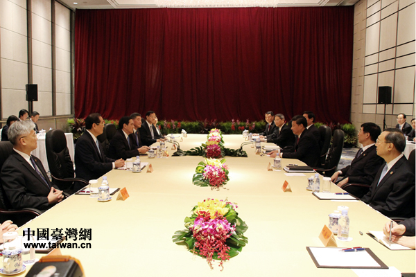 兩岸領(lǐng)導(dǎo)人習(xí)近平、馬英九在新加坡舉行會(huì)面。(中國(guó)臺(tái)灣網(wǎng) 張潔 攝)