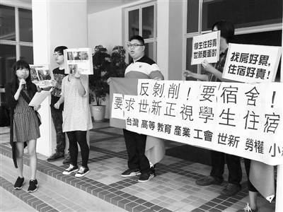 因“三限六不”等政策,在臺就讀的陸生常遭到不公平對待。圖為臺灣世新大學(xué)學(xué)生勞動權(quán)益行動小組抗議要求校方正視陸生住宿權(quán)益。(資料圖片)