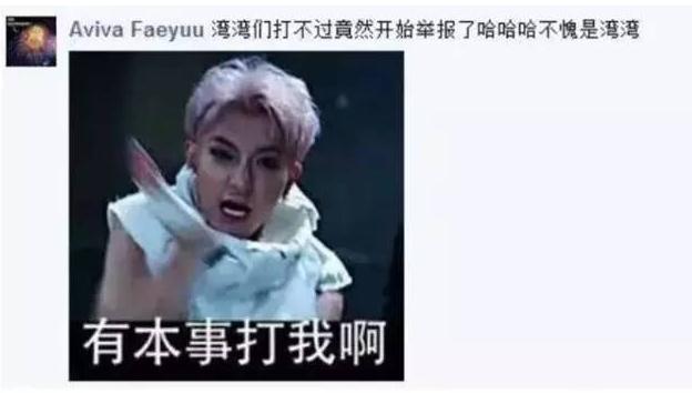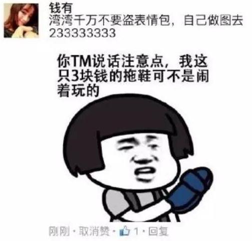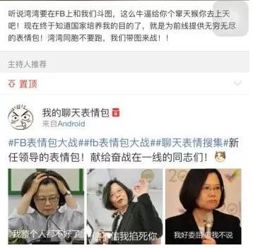 目前,在大陸網友成千上萬種“表情包”(而且圖片和語言還都不重樣)的轟炸下,部分內心脆弱的臺灣網民被嗆得直接找Facebook網站方面舉報,稱大陸網友的“表情包”太粗暴;也有一些內心堅強的臺灣網民,則選擇“盜用”大陸網友的圖片素材,重新制成他們的表情包進行“還擊”…