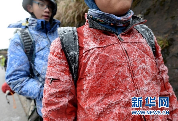 1月24日,香港市民在大帽山郊野公園爬山時,外衣結(jié)冰。新華社發(fā)(林良堅 攝)