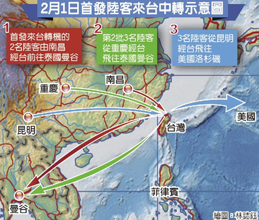 今年1月5日,國(guó)臺(tái)辦表示,為落實(shí)兩岸領(lǐng)導(dǎo)人會(huì)面成果,大陸有關(guān)方面擬試點(diǎn)開(kāi)放大陸居民經(jīng)臺(tái)灣桃園機(jī)場(chǎng)的中轉(zhuǎn)業(yè)務(wù),南昌、昆明、重慶為首批試點(diǎn)城市。大陸居民在上述三城市可持護(hù)照及聯(lián)程機(jī)票和赴第三地的登機(jī)牌經(jīng)臺(tái)灣桃園機(jī)場(chǎng)進(jìn)行不出機(jī)場(chǎng)的中轉(zhuǎn)。