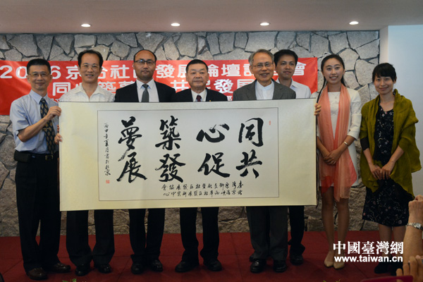 北京海峽兩岸社區(qū)發(fā)展研究中心贈予臺灣原鄉(xiāng)文化暨社區(qū)發(fā)展協(xié)會一幅寫有“同心筑夢、共促發(fā)展”的字畫。 (中國臺灣網(wǎng) 朱煉 攝)