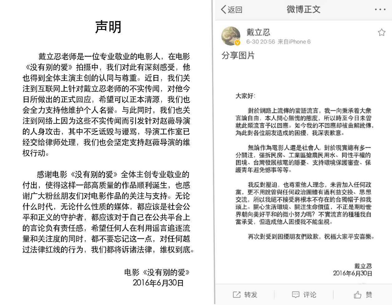 《沒有別的愛》片方及戴立忍的澄清聲明