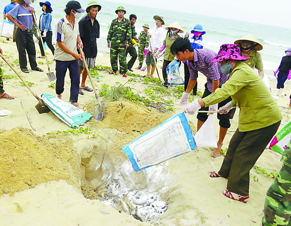 4月,越南漁民在海灘上掩埋死魚。臺塑集團在當?shù)赝顿Y的河靜大煉鋼廠被指制造了污染。
