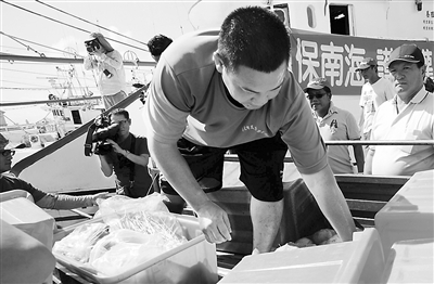 臺(tái)灣漁民駕船自費(fèi)往返太平島,帶回島上的淡水和椰子,向世界證明祖先留下的太平島是島不是礁。圖為7月20日漁民在出行前為船只補(bǔ)充給養(yǎng)。