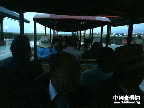 記者們上了景區(qū)專(zhuān)門(mén)為記者安排的小火車(chē)“專(zhuān)列”。由于青海的海西州時(shí)差比北京晚91分鐘,雖然5點(diǎn)多了,但天還是一片黑。(中國(guó)臺(tái)灣網(wǎng) 蕪?fù)?攝)