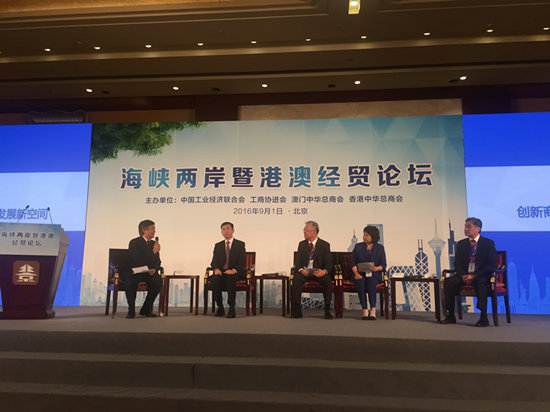 人民網(wǎng)北京9月1日電 1日上午,中國(guó)工業(yè)經(jīng)濟(jì)聯(lián)合會(huì)、工商協(xié)進(jìn)會(huì)、澳門中華總商會(huì)和香港中華總商會(huì)在北京舉行第五屆“海峽兩岸暨港澳經(jīng)貿(mào)論壇”。論壇旨在促進(jìn)海峽兩岸暨港澳地區(qū)間的經(jīng)貿(mào)合作與交流,以“新常態(tài)、新思路、新機(jī)遇、新發(fā)展”為主題,著重探討兩岸四地在新形勢(shì)下,如何有效整合配置資源,促進(jìn)經(jīng)濟(jì)轉(zhuǎn)型,加強(qiáng)協(xié)同創(chuàng)新,克服挑戰(zhàn),迎接發(fā)展新契機(jī)。