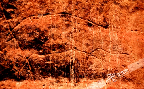 整塊巖畫(huà)以點(diǎn)成線的方式鑿刻,簡(jiǎn)約的線條中透露出一種生命力和表現(xiàn)力。