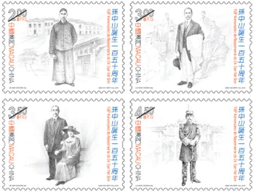 紀(jì)念大會(huì)以外,澳門(mén)郵政還推出以孫中山誕生150周年為主題的紀(jì)念郵品,以紀(jì)念這位偉大的民主革命先驅(qū)。郵品設(shè)計(jì)選取孫中山先生在澳門(mén)行醫(yī)、在上海召開(kāi)中國(guó)同盟會(huì)最高干部會(huì)議,在廣州就職護(hù)法軍政府大元帥等幾個(gè)重要?dú)v史節(jié)點(diǎn),畫(huà)面造型以全素描的方式呈現(xiàn),給人以親切、立體的視覺(jué)效果。