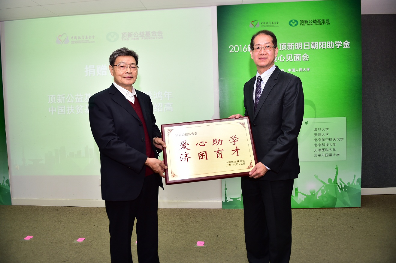 中國扶貧基金會江紹高副會長向頂新公益基金會滕鴻年理事長頒發(fā)榮譽牌匾
