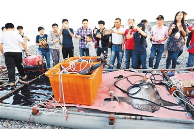 圖為“洄游吧”體驗者圍觀花蓮七星潭漁獲。
