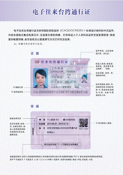 據(jù)了解,電子往來(lái)臺(tái)灣通行證為參照有關(guān)國(guó)際標(biāo)準(zhǔn)設(shè)計(jì)制作的卡式證件,內(nèi)嵌非接觸式集成電路芯片。前往臺(tái)灣簽注不再采取貼紙的方式,而是直接打印在證件背面,并可重復(fù)擦寫。成人電子往來(lái)臺(tái)灣通行證有效期延長(zhǎng)為10年,對(duì)未滿16周歲的仍簽發(fā)5年有效通行證。根據(jù)《中華人民共和國(guó)出境入境管理法》有關(guān)規(guī)定,經(jīng)國(guó)務(wù)院批準(zhǔn),申領(lǐng)電子往來(lái)臺(tái)灣通行證應(yīng)當(dāng)按規(guī)定留存持證人指紋信息。已留存指紋信息的持證人出入境時(shí),可以按規(guī)定自助通關(guān)。