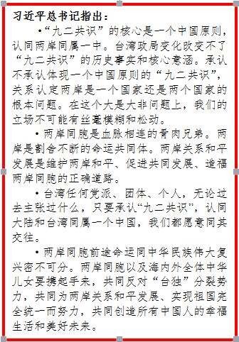 2016年兩岸關(guān)系的變化深刻揭示,堅持體現(xiàn)一個中國原則的“九二共識”,兩岸關(guān)系才能行穩(wěn)致遠(yuǎn),兩岸同胞才能同享福祉;毀棄這一政治基礎(chǔ),臺海上空就會陰云密布,臺灣同胞利益就會受到損害。2017年,兩岸關(guān)系仍面臨諸多不確定因素和風(fēng)險,兩岸同胞尤其是臺灣同胞當(dāng)團(tuán)結(jié)一致,展現(xiàn)決心和勇氣,牢牢把握兩岸關(guān)系和平發(fā)展正確方向,努力維護(hù)臺海和平穩(wěn)定。