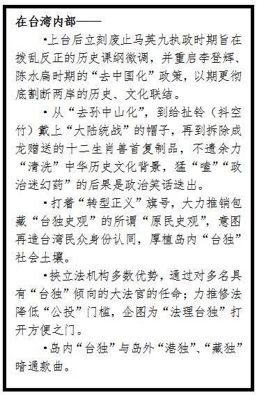 重返執(zhí)政的民進(jìn)黨始終不放棄“臺獨(dú)”錯誤主張,蔡英文當(dāng)局上臺半年多來,涉“獨(dú)”言行不斷“刷屏”。懾于大陸的強(qiáng)大實(shí)力和反“獨(dú)”決心,民進(jìn)黨當(dāng)局不敢公然推動“法理臺獨(dú)”,改以推行偽裝性更強(qiáng)的“柔性臺獨(dú)”,一方面直接在史觀問題上“歪批三國”,一方面縱容、助推各路“獨(dú)”派人物群魔亂舞。