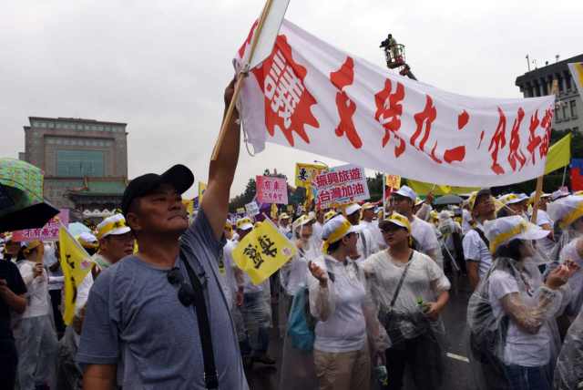 島內(nèi)多個社會團(tuán)體在民進(jìn)黨中央黨部前集會,呼吁民進(jìn)黨承認(rèn)“九二共識”及其兩岸同屬一中的核心意涵。(陳鍵興攝)