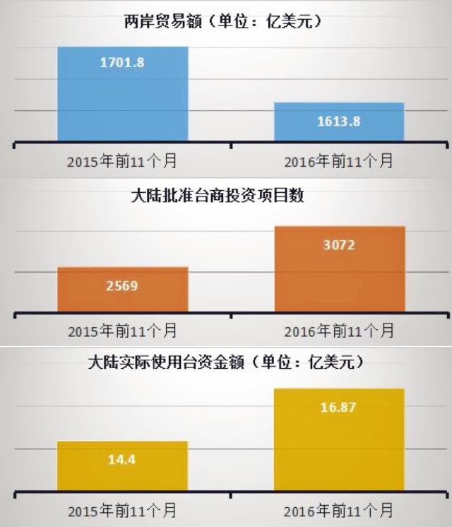 面對困難與挑戰(zhàn),大陸方面積極作為,推進(jìn)兩岸各領(lǐng)域交流合作,促進(jìn)兩岸經(jīng)濟(jì)社會融合發(fā)展,本著“兩岸一家親”的理念,同臺灣同胞分享大陸發(fā)展機(jī)遇,推動兩岸經(jīng)濟(jì)合作邁上新臺階,不斷擴(kuò)大基層民眾的參與面和獲益面。在兩岸工商界和兩岸同胞共同努力下,2016年兩岸經(jīng)濟(jì)交流合作穩(wěn)中有進(jìn)。