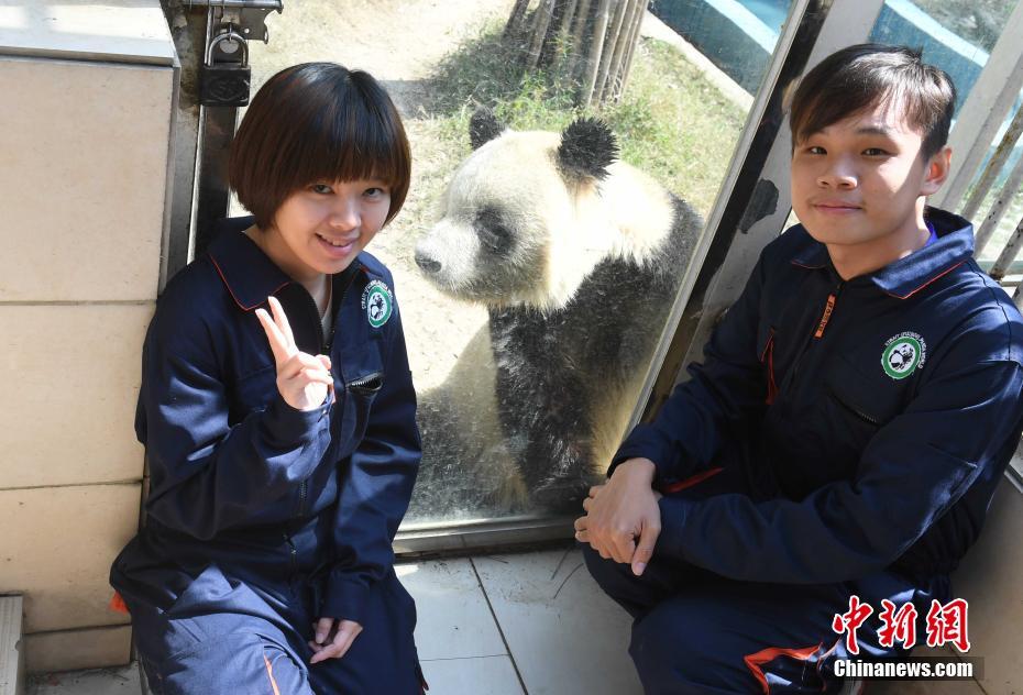2月16日,來自臺灣大學(xué)、臺灣嘉義大學(xué)的8名臺灣大學(xué)生在2名老師的帶領(lǐng)下在海峽(福州)熊貓世界參訪交流并體驗飼養(yǎng)員工作。圖為臺灣大學(xué)大二學(xué)生鄭志明(右)、臺灣嘉義大學(xué)大四學(xué)生王俞琇(左)與4號大熊貓合影留念。 劉可耕 攝