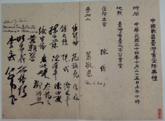 從1945年8月15日日本天皇宣布無條件投降至“中國戰(zhàn)區(qū)臺灣省受降典禮”(圖二:受降典禮簽名。┡e行的10月25日,其間的70天常被稱為“空白期”。實際上,從1945年9月1日起,已有中國官方和軍方人員到達(dá)臺灣并開始工作。當(dāng)年的《大公報》記者李純青在《臺北散記》里說:“第一批去臺灣的有三個人,福建省顧問黃澄淵,中美合作所黃昭明,三民主義青年團(tuán)張士德,他們9月1日到達(dá)臺北,次為中國空軍,再次乃是前進(jìn)指揮所”。
