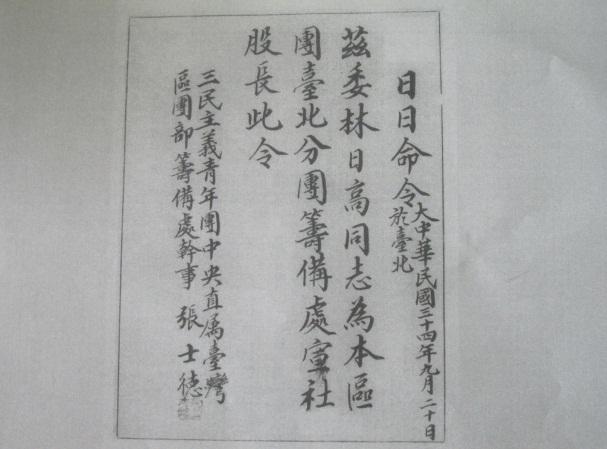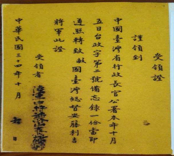 據(jù)我所知,黃澄淵曾于1937年任福建上杭縣長、1938年任福建古田縣長、1941年任福建仙游縣長。1945年9月1日以福建省政府顧問名義隨美軍陸軍駐閩軍務(wù)處三名上尉軍官到臺慰問并解救拘留在臺的1300余名盟軍俘虜,此項工作“于10日之內(nèi)完成”;黃昭明是中美合作所閩南指揮部的上校參謀;張士德是臺灣義勇隊上校副總隊長,時以“三青團(tuán)臺灣區(qū)團(tuán)部籌備處干事”的名義到臺,并即征收團(tuán)員、組建機(jī)構(gòu)、任命干部,他給林日高的任命書是1945年9月20日簽發(fā)的(圖三)。至于“中國空軍”部隊,其駐地在臺南,首長為“張司令”;“前進(jìn)指揮所”是臺灣省行政長官公署和臺灣省警備司令部的先遣隊,于10月4日到達(dá)臺北并即辦理公務(wù),10月6日,侵臺日軍參謀長諫山春樹受領(lǐng)“中國臺灣省行政長官公署本(1945)年10月5日臺政字第二號備忘錄”(圖四:《受領(lǐng)證》)。諫山春樹后來作為戰(zhàn)犯被判無期徒刑。另外,“美國陸軍駐閩輔助空軍地面軍務(wù)總處主任秘書”陳鏡秋等人也在9月間到了臺灣。而陳孔達(dá)中將率領(lǐng)的“國軍70軍”是9月17日到達(dá)臺灣的。