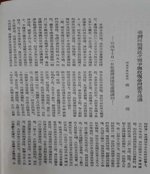 據(jù)檔案記載,中國官方先后于1945年11月10日、16日、18日、20日和27日正式接收臺北、臺中、臺南、嘉義和花蓮電臺。然而,1945年10月1日,黃澄淵已在“臺灣廣播電臺播講”《臺灣同胞對此次戰(zhàn)爭與收復(fù)臺灣應(yīng)有認(rèn)識》(圖五)。我想,在“正式接收”之前應(yīng)該有官方人員介入做“非正式”接收也。