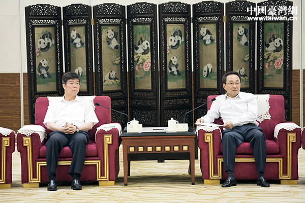 四川省常務(wù)副省長(zhǎng)王寧(右)會(huì)見(jiàn)“海峽兩岸記者四川行”聯(lián)合采訪(fǎng)團(tuán)一行,國(guó)務(wù)院臺(tái)辦主任助理周寧(左)參加會(huì)見(jiàn)。(中國(guó)臺(tái)灣網(wǎng) 于斯文 攝)