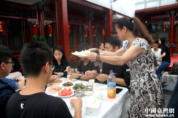 好客的北京社區(qū)居民包了四種餡的餃子歡迎客人,請來了剪紙、糖人、面人、京劇臉譜等非物質(zhì)文化遺產(chǎn)傳承人與兩岸青年互動(dòng)體驗(yàn),一同制作具有北京特色的紀(jì)念品,并和兩岸青年一起聯(lián)歡表演文藝節(jié)目,最后,臺(tái)灣大學(xué)生幾人一組,到社區(qū)居民家中做客,了解胡同文化,進(jìn)行互動(dòng)交流。