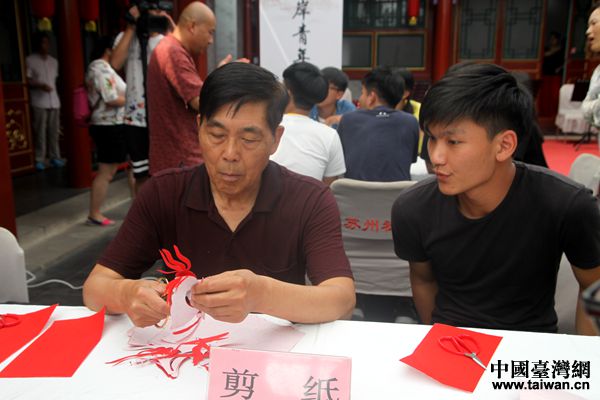 臺(tái)灣大學(xué)生向非物質(zhì)文化遺產(chǎn)傳承人學(xué)習(xí)剪紙。(中國臺(tái)灣網(wǎng) 李杰 攝)