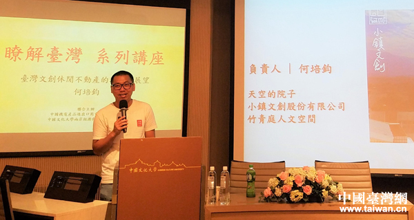 本期主講嘉賓何培鈞是臺灣青年創(chuàng)業(yè)代表,他在講座時與大家分享了創(chuàng)業(yè)歷程,并就如何在發(fā)展小鎮(zhèn)文化產(chǎn)業(yè)的同時,最大限度地讓當(dāng)?shù)鼐用駝?chuàng)收并保留當(dāng)?shù)匚幕厣茸h題與聽眾進(jìn)行了互動。近十二年來,他堅持從事臺灣文創(chuàng)休閑產(chǎn)業(yè),將一座荒廢的古厝修復(fù)成臺灣最美民宿“天空的院子”,成立了“小鎮(zhèn)文創(chuàng)股份有限公司”,積極探索將文化融入大眾日常的文創(chuàng)休閑產(chǎn)業(yè)中,串聯(lián)在地設(shè)計、生產(chǎn)、銷售的供應(yīng)鏈,創(chuàng)造在地生產(chǎn)與活力,取得了明顯的成效。談及到大陸創(chuàng)業(yè),他說大陸進(jìn)步快、硬件條件好,兩岸美麗鄉(xiāng)村建設(shè)發(fā)展過程中有很多相似問題,臺灣年輕人有創(chuàng)意,到大陸要多了解大陸的長處、多學(xué)習(xí)大陸的優(yōu)點,兩岸增進(jìn)彼此了解、相互學(xué)習(xí),才能化解差異、攜手提高競爭力。