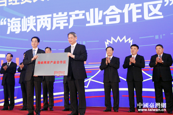 中共中央臺(tái)辦、國務(wù)院臺(tái)辦主任張志軍向廣西壯族自治區(qū)副主席張曉欽授牌“海峽兩岸產(chǎn)業(yè)合作區(qū)”。(中國臺(tái)灣網(wǎng) 王怡然 攝)