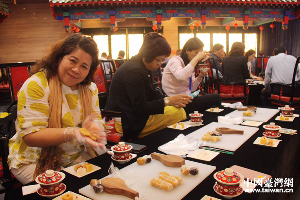 臺(tái)商參訪團(tuán)在老舍茶館體驗(yàn)做月餅(中國臺(tái)灣網(wǎng) 孫伊靜 攝)