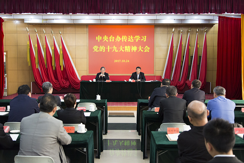10月24日下午,中央臺辦召開傳達學習十九大精神大會。會議由張志軍主任主持,十九大代表、陳元豐副主任傳達黨的十九大精神并介紹了大會盛況。張志軍主任對中央臺辦認真貫徹落實十九大精神作出動員部署。辦領(lǐng)導、海協(xié)會領(lǐng)導、機關(guān)全體黨員干部和事業(yè)單位班子成員參加了大會。