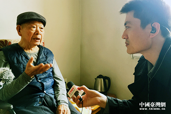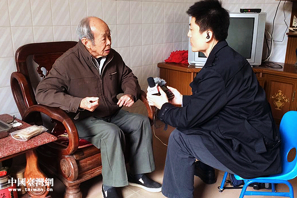 沈涿良老先生1950年跟隨國民黨軍隊(duì)撤退到臺灣,1987年才搭上了第一批回大陸探親的飛機(jī),如今已回到福建省漳州市東山縣東沈村的老家定居。圖為沈涿良先生(左)接受記者穆亮龍(右)采訪。