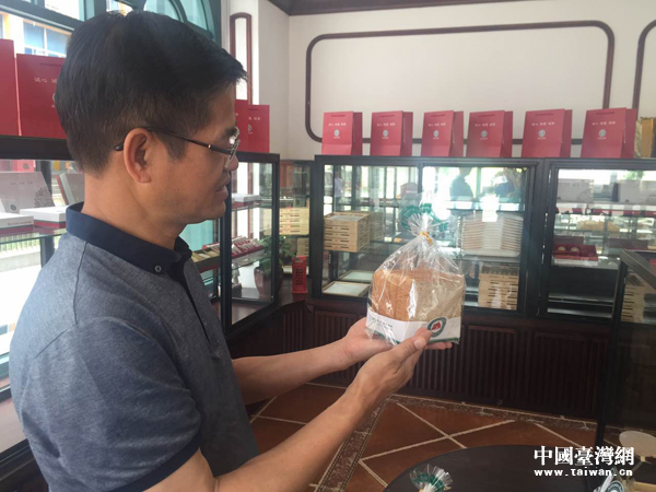 老臺(tái)商王江明1997年從臺(tái)灣淡水來(lái)到大陸,退休后在廈門開(kāi)了一家面包體驗(yàn)店。圖為王江明向記者介紹面包產(chǎn)品。