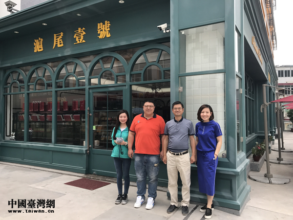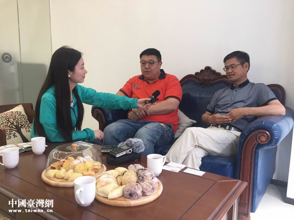 在大陸經(jīng)營(yíng)面包體驗(yàn)店的老臺(tái)商王江明(右一)從高雄“三顧茅廬”請(qǐng)到了著名烘焙師鄧宇鈞(右二)來(lái)廈門一起做面包。圖為老少臺(tái)商接受央廣記者李金鑫(左一)采訪。