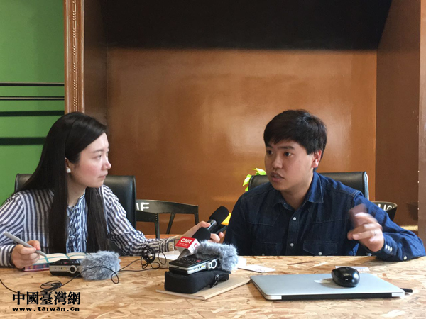 臺(tái)灣青年呂紹園(右)2016年放棄了原本薪水優(yōu)沃的工作,帶著電子商務(wù)的夢(mèng)想來(lái)大陸創(chuàng)業(yè)。圖為接受央廣記者李金鑫采訪。