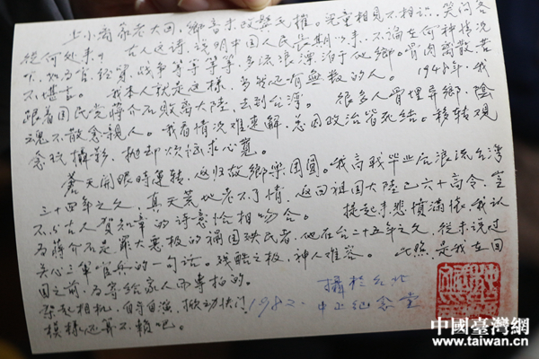 中國臺灣網(wǎng)12月5日西安訊。ㄓ浾 扶海濤)“少小離家老大回,鄉(xiāng)音未改鬢毛衰!93歲的種志斌翻出他在1982年于臺北中正紀(jì)念堂前留下的黑白老照片,照片背面有他用繁體字寫的一段介紹文字,開頭便是唐代詩人賀知章所寫的《回鄉(xiāng)偶書》詩句。這張照片是他專門為寄給遠(yuǎn)在陜西省華縣的家人而拍的。一年后,59歲的他秘密踏上了返回故鄉(xiāng)的路;這條返鄉(xiāng)之路,他足足等了34年。