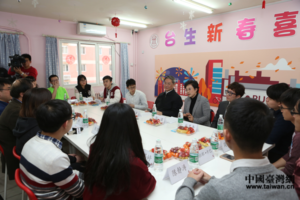 室外寒風(fēng)刺骨,屋里暖意融融、笑聲陣陣。張志軍與人民大學(xué)黨委書記靳諾一同走進(jìn)國際關(guān)系學(xué)院2015級(jí)臺(tái)灣同學(xué)楊思婷與大陸同學(xué)同住的宿舍,查看生活服務(wù)設(shè)施,仔細(xì)詢問生活上有什么困難,學(xué)習(xí)成績?nèi)绾,與大陸學(xué)生共同學(xué)習(xí)生活情況。在與張志軍的座談互動(dòng)中,臺(tái)灣學(xué)生踴躍發(fā)言,講述選擇就讀人民大學(xué)的原因、在校學(xué)習(xí)生活和參加實(shí)習(xí)的豐富多彩、與大陸同學(xué)交流融合的感受,都表示來人民大學(xué)讀書是完全正確的選擇,收獲豐碩,并引以為榮。臺(tái)灣教師林承鐸分享了自己在大陸的讀書求職經(jīng)驗(yàn),并用習(xí)近平總書記的話“打鐵還需自身硬”勉勵(lì)學(xué)弟學(xué)妹們。參加座談的大多數(shù)臺(tái)灣學(xué)生表達(dá)了希望畢業(yè)后繼續(xù)在大陸發(fā)展事業(yè)的意愿。