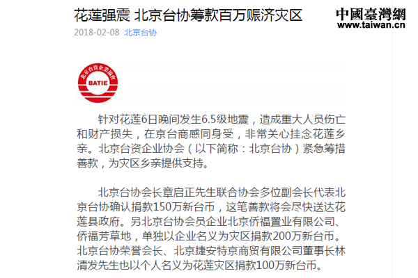 “花蓮6日晚間發(fā)生6.5級地震,造成重大人員傷亡和財產(chǎn)損失,在京臺商感同身受,非常關(guān)心掛念花蓮鄉(xiāng)親。”北京臺資企業(yè)協(xié)會(以下簡稱“北京臺協(xié)”)8日在微信公眾號上宣布,北京臺協(xié)會長章啟正先生聯(lián)合協(xié)會多位副會長代表北京臺協(xié)確認(rèn)捐款150萬新臺幣,這筆善款將會盡快送達(dá)花蓮縣政府。另北京臺協(xié)會員企業(yè)北京僑福置業(yè)有限公司、僑福芳草地,單獨(dú)以企業(yè)名義為災(zāi)區(qū)捐款200萬新臺幣。北京臺協(xié)榮譽(yù)會長、北京捷安特京商貿(mào)有限公司董事長林清發(fā)先生也以個人名義為花蓮災(zāi)區(qū)捐款100萬新臺幣。