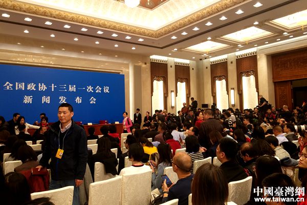 3月2日,全國政協(xié)十三屆一次會議新聞發(fā)布會上。(中國臺灣網(wǎng) 盧佳靜 攝)
