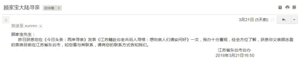 就在頭條尋人將顧家寶的尋親消息發(fā)布后,尋人郵箱便收到來自江蘇省東臺市臺辦的郵件,使得尋親過程有了重大進展。