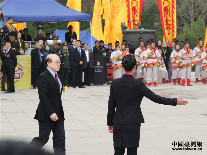 中共中央臺辦、國務(wù)院臺辦主任劉結(jié)一上臺向軒轅黃帝敬獻(xiàn)花籃。(中國臺灣網(wǎng) 李寧 攝)