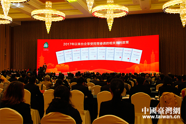 會上展示昆山市2017年以來臺企享受同等待遇的相關系列政策。(中國臺灣網(wǎng) 汪明珠 攝)